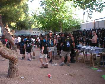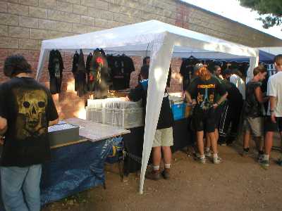 Ya dentro del recinto nos encontramos varias zonas. Al mismo entrar, el MetalMarket: un mercadillo de 8 ó 10 puestos de extranjeros cerrado (acceso 2€) en el que nos podíamos encontrar con discos y camisetas de importación (no mejores que las españolas, pero si diferentes), Lp’s y Singles en Vinilo, espacial para coleccionistas o amantes del plástico, e incluso Cassettes de grupos super-desconocidos. Las conversaciones con el personal eran muy cortas, pues salvo un sudamericano, los demás "ni papa" de Español.