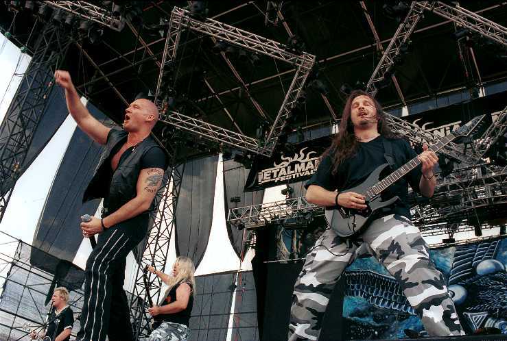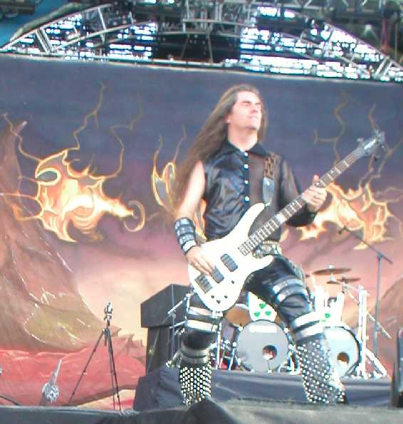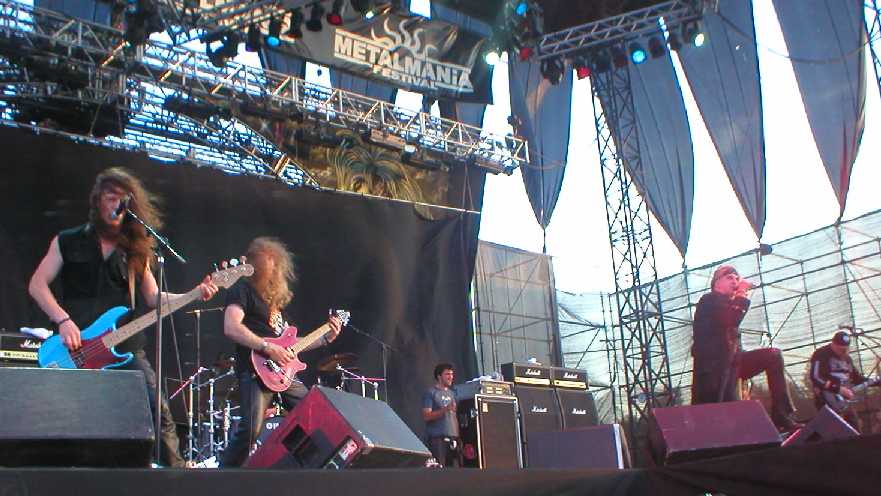 Todavía no se a que hora empezaron, pues de los 3 o 4 horarios de los que disponía, puede que ninguno fuera correcto. Con el cambio de la señalización para el acceso al aparcamiento, el ‘pesao’ de turno que no andaba ni cuesta abajo y la prohibición del acceso con acreditación por la entrada principal, llegué al recinto a las cinco y cuarto, con la sorpresa de que llevaban ya –SIETE- canciones, de una de mis bandas preferidas de todo el Festival (de todas las formas la culpa es mía por no haber llegado a las 15:30 h como decía el más "madrugador" de mis horarios). Entré escuchando "Fear", el corte que más me gusta de su último disco "Black Sun", cuya portada decoraba el fondo del escenario. Ya habían tocado según he sabido después, grandes temas como Chainbreaker, Nuclear Fire o Armageddon.