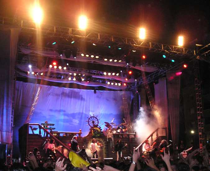 Tras caer el telón, el primer miembro en aparecer fue Txus (alma mater de Mägo), que saludó desde su batería, en la parte superior del barco pirata que les sirve de ambientación. Ondeó una bandera de la Región de Murcia (seguro que las tiene todas, y queda muy bien en cada sitio) y comenzaron a aparecer, uno tras otro, el teclista, guitarristas y bajo, cantante, y finalmente flauta y violín. Coincidiendo con fuegos artificiales comienzan a descargar "Van a rodar cabezas", y la gran cantidad de público empezó a enfervorecer. En las fiesta de Alcantarilla los conciertos son ‘gratix’ y acuden gentes de diversa calaña, pero en es caso del este concierto, la gran mayoría (sean más o menos rockeros) conocían a Mägo y sus canciones. Continuaron,