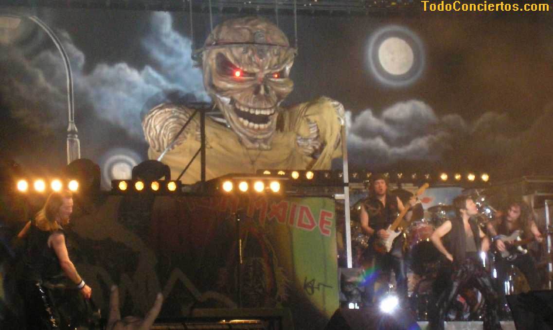 Para terminar, y con el telón de la portada del disco homónimo , "Iron Maiden", tema que es uno más en la versión de estudio, pero que queda claro que es uno de los himnos inevitables que en directo gana muchísimo y en la que, como siempre, apareció un enorme Eddie con la frente abierta en la parte trasera del escenario mientras las guitarras se aceleraban, entre fuegos artificiales para poner un punto y seguido al show.