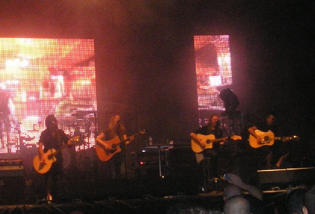 Punto y seguido que aprovechamos para reponer provisiones y algo más, pero poco, porque antes de darnos cuenta la fiesta acústica continuó con "Pídemelo otra vez", que en su anterior gira Barricada nos ofreció una versión acústica, también, y "A la sombra de una mentira" con Aurora Beltrán a la voz y las cuatro hachas acústicas alzando su sonido con sus dueños sentados en taburetes al frente del escenario.